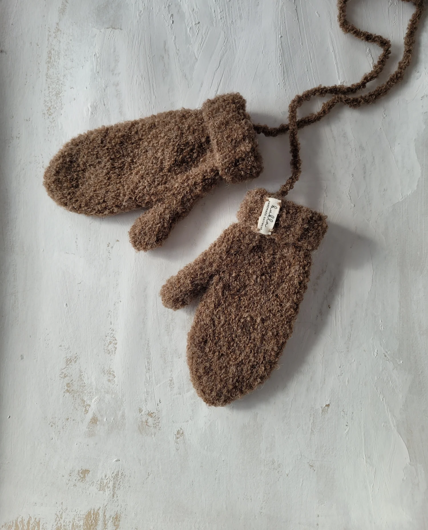 Rękawiczki Full of Knots to niezwykle miłe i miękkie w dotyku rękawiczki zrobione ręcznie na drutach z wełny alpaki typu bouclé. Posiadają sznurek - niezgubek aby mogły towarzyszyć Ci jak najdłużej :)