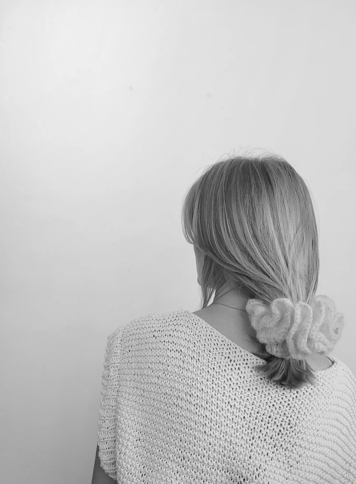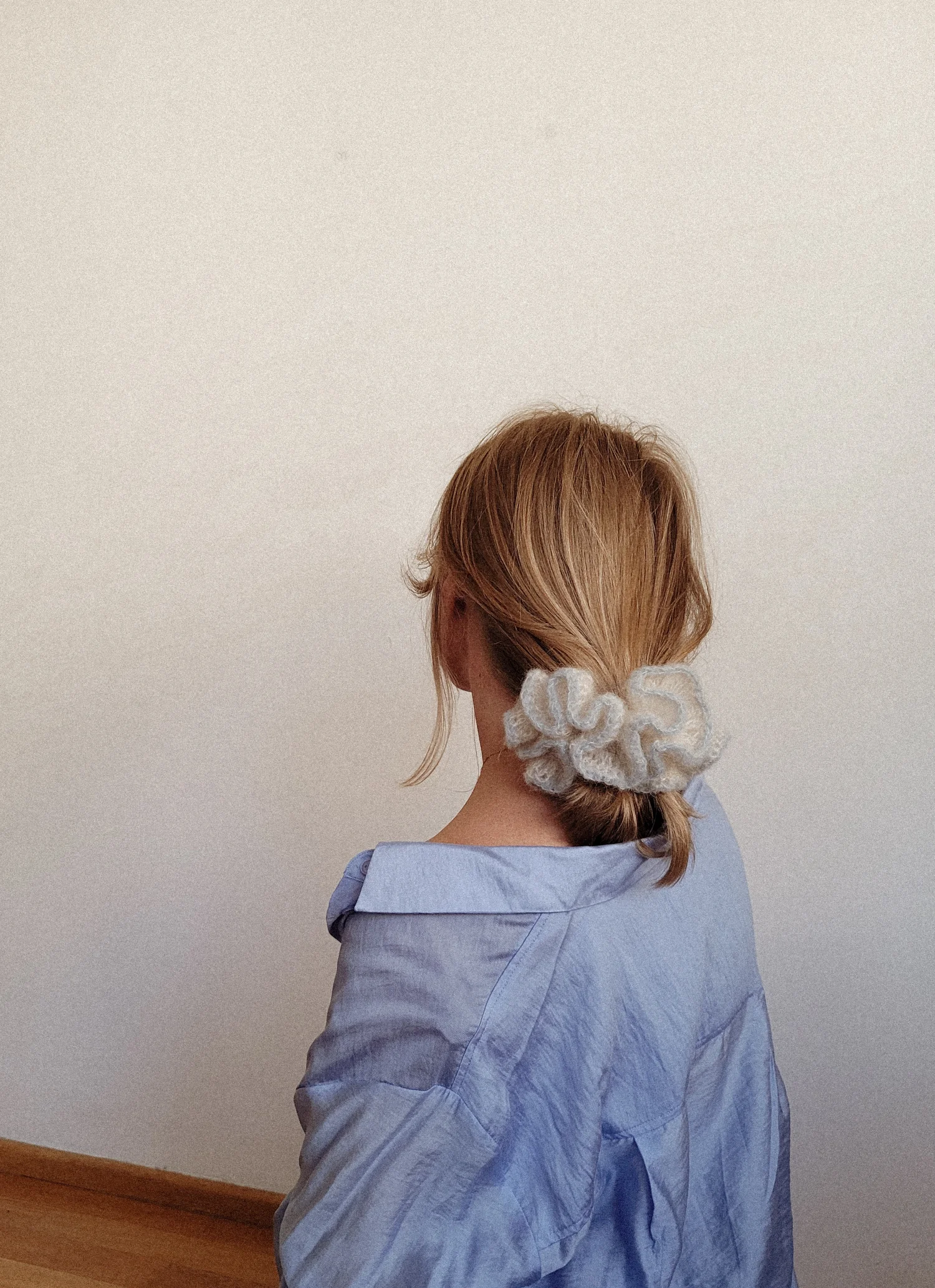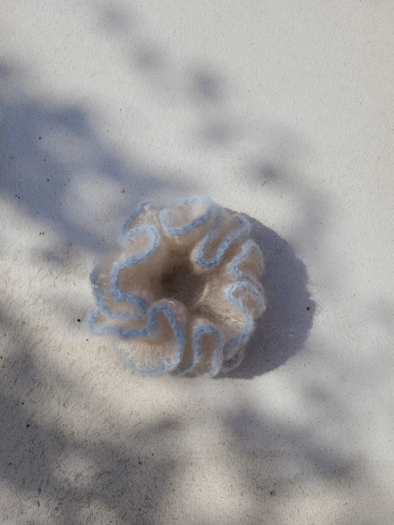 Gumka scrunchie w kolorze śmietanki i błękitu. Zrobiona ręcznie na szydełku z miękkiej i lekkiej wełny moherowej z dodatkiem jedwabiu morwowego. Wygląda pięknie na włosach lub jako ozdoba na nadgarstku.