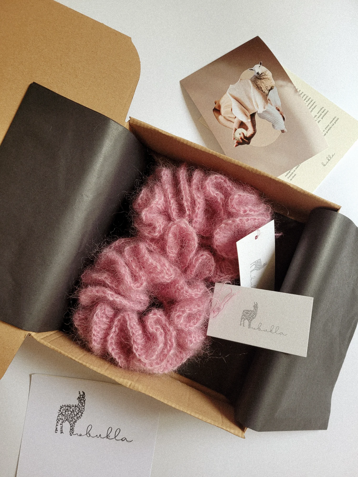 Gumka scrunchie w kolorze różowym. Zrobiona ręcznie na szydełku z miękkiej i lekkiej wełny moherowej z dodatkiem jedwabiu morwowego. Wygląda pięknie na włosach lub jako ozdoba na nadgarstku.