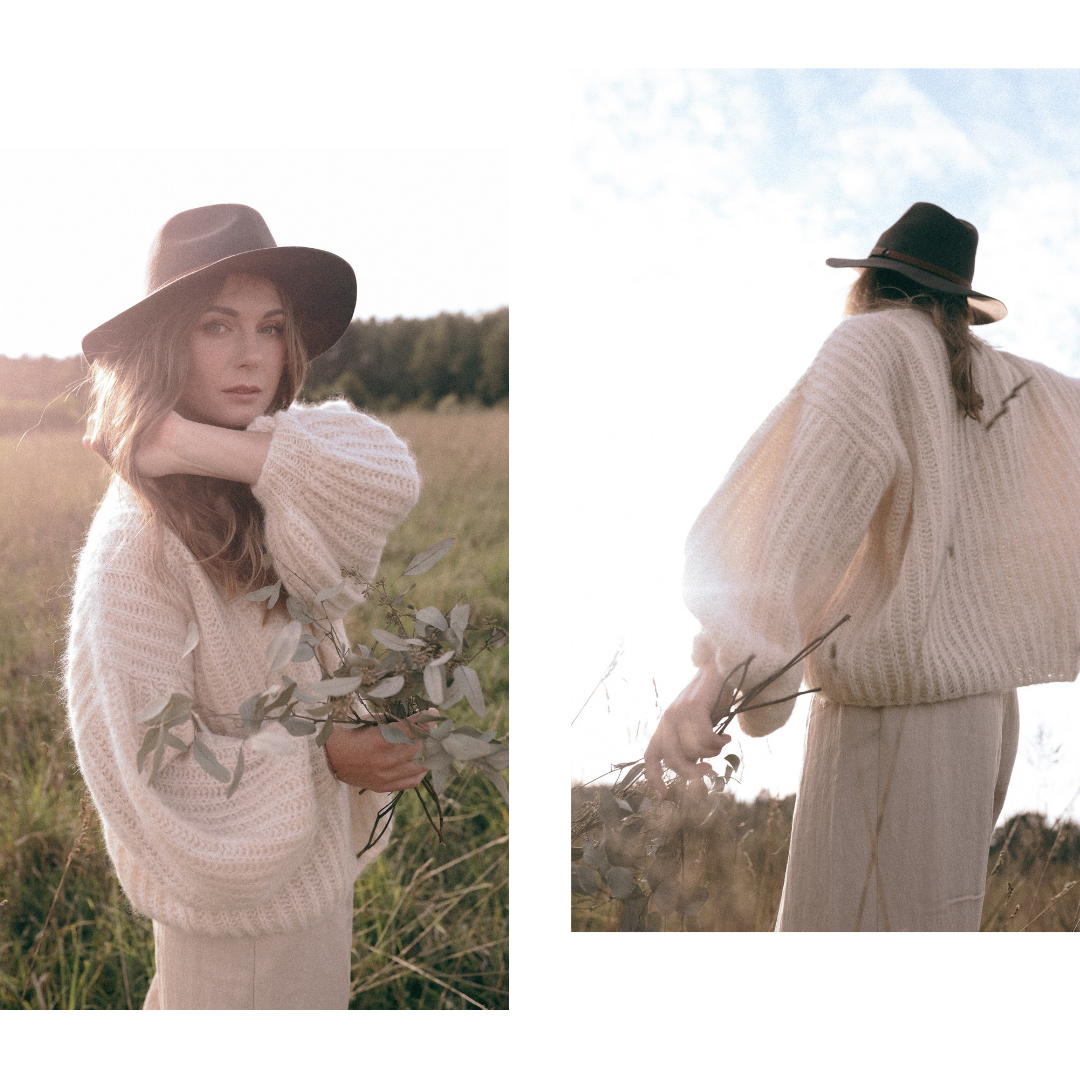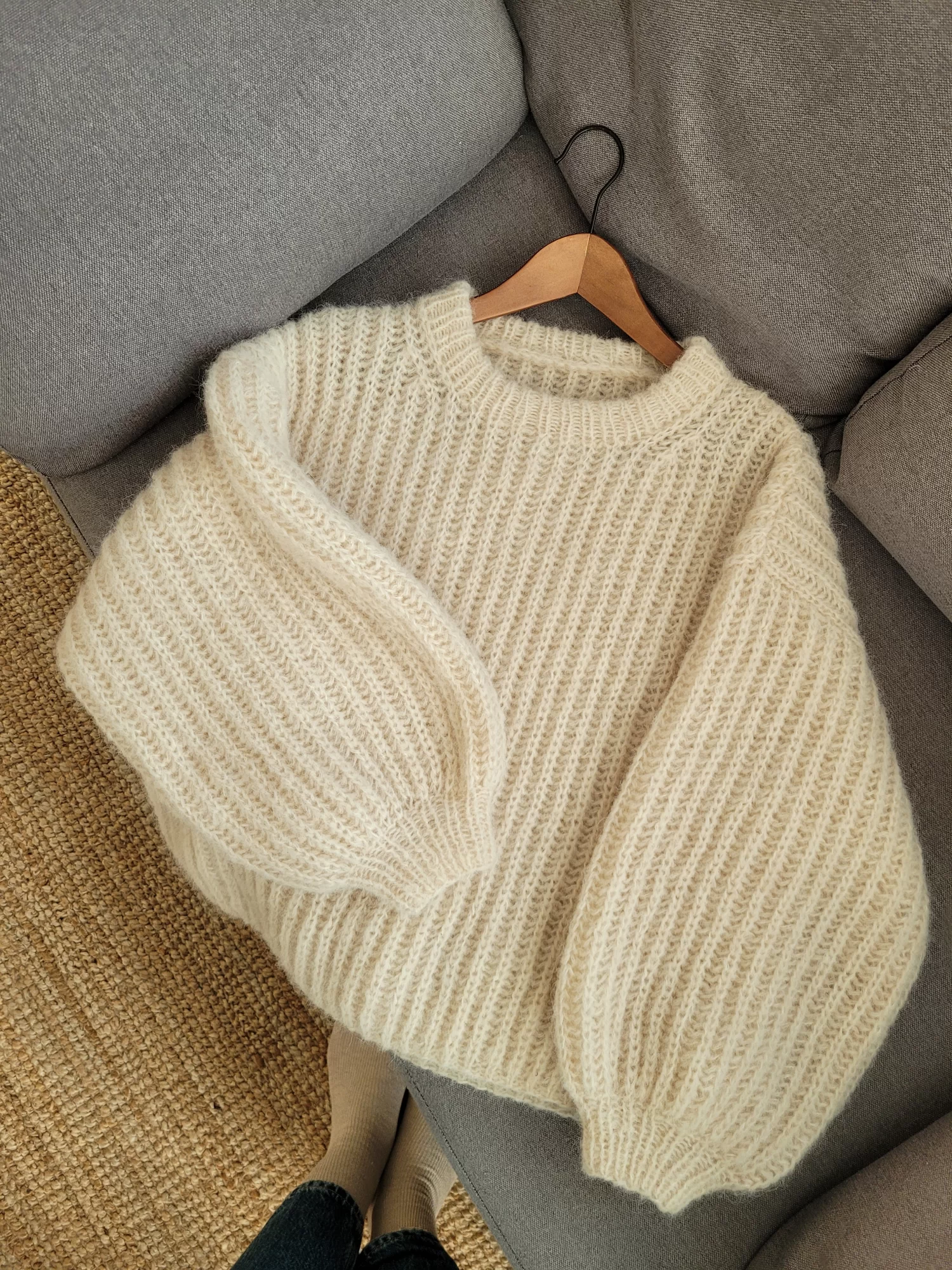 Sweter Bianca jest swetrem robionym na drutach ściegiem angielskim - wyjątkowo miękkim i puszystym. Dzięki włóknom alpaki i jedwabiu jest bardzo ciepły i otulający. Ma oversizowy wygodny krój, który idealnie pasuje do jeansów lub spódnic. Jego bufiaste rękawy wykończone są ściągaczami.
