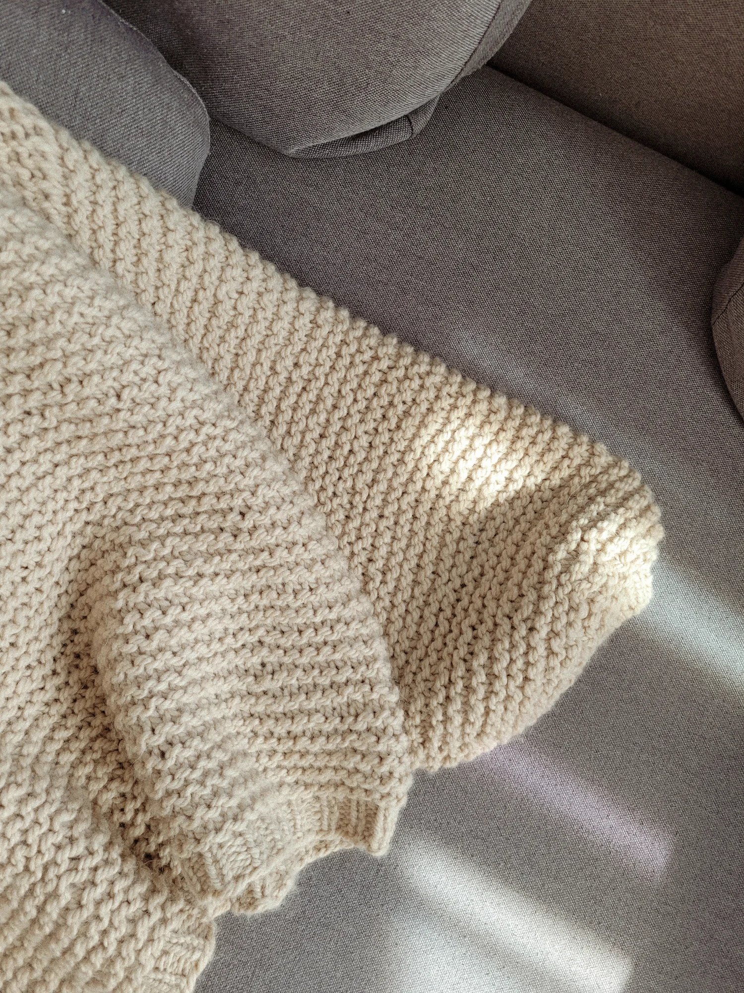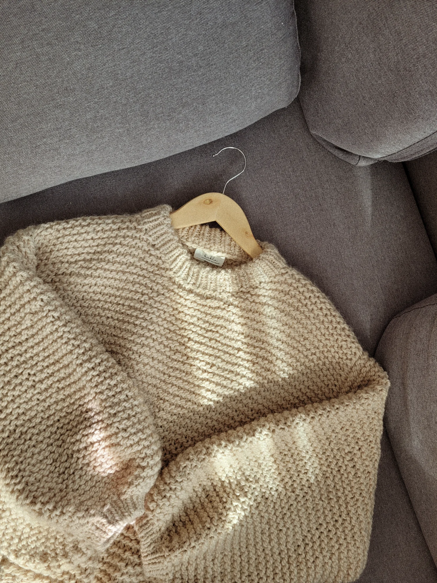 Gruby wełniany sweter zrobiony ręcznie na drutach. Ma oversizowy krój i balonowe rękawy zakończone wąskim ściągaczem. Jest mięsisty i bardzo ciepły. Ścieg francuski, którym jest wydziergany nadaje mu wyjątkowości i charakteru. Pięknie wygląda w casualowym zestawieniu.