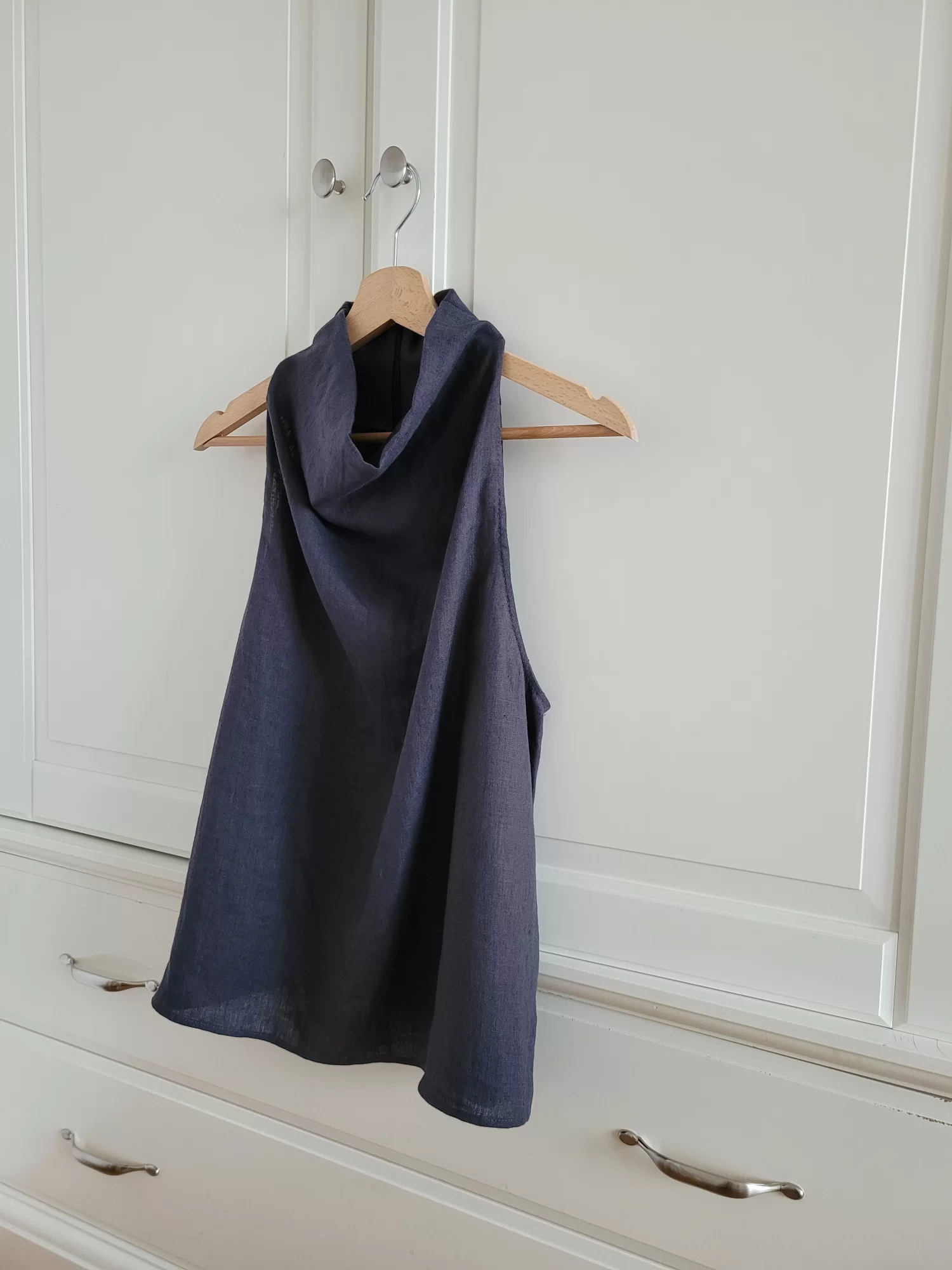 Meg Linen Top to lniany top w kolorze grafitowym o prostej, minimalistycznej formie. Ma dekolt typu halter, pięknie podkreśla ramiona, jest luźny i bardzo wygodny.