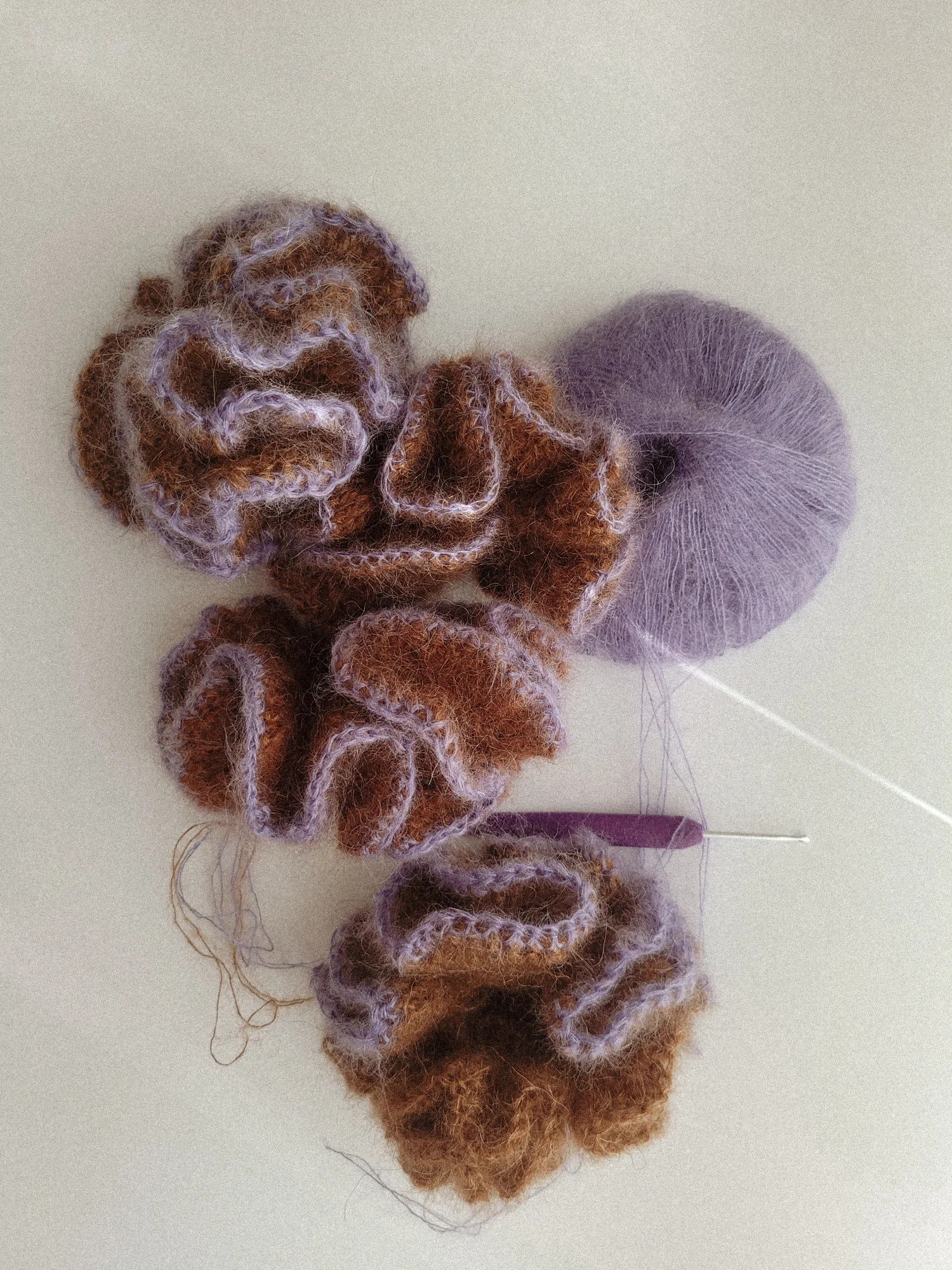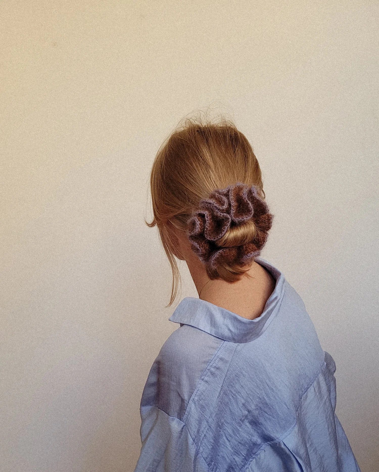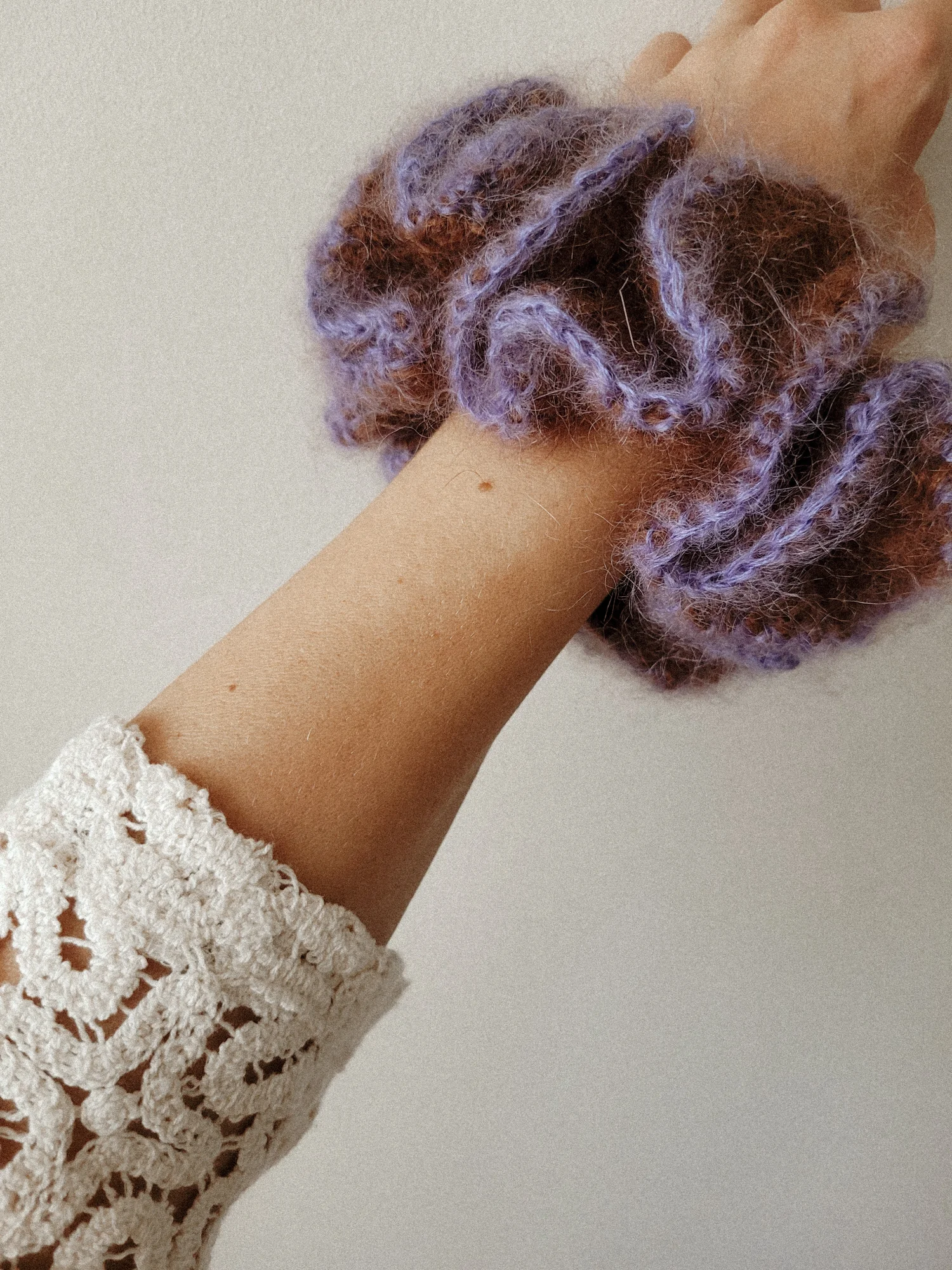 Gumka scrunchie w kolorze czekolady i fiołka. Zrobiona ręcznie na szydełku z miękkiej i lekkiej wełny moherowej z dodatkiem jedwabiu morwowego. Wygląda pięknie na włosach lub jako ozdoba na nadgarstku.