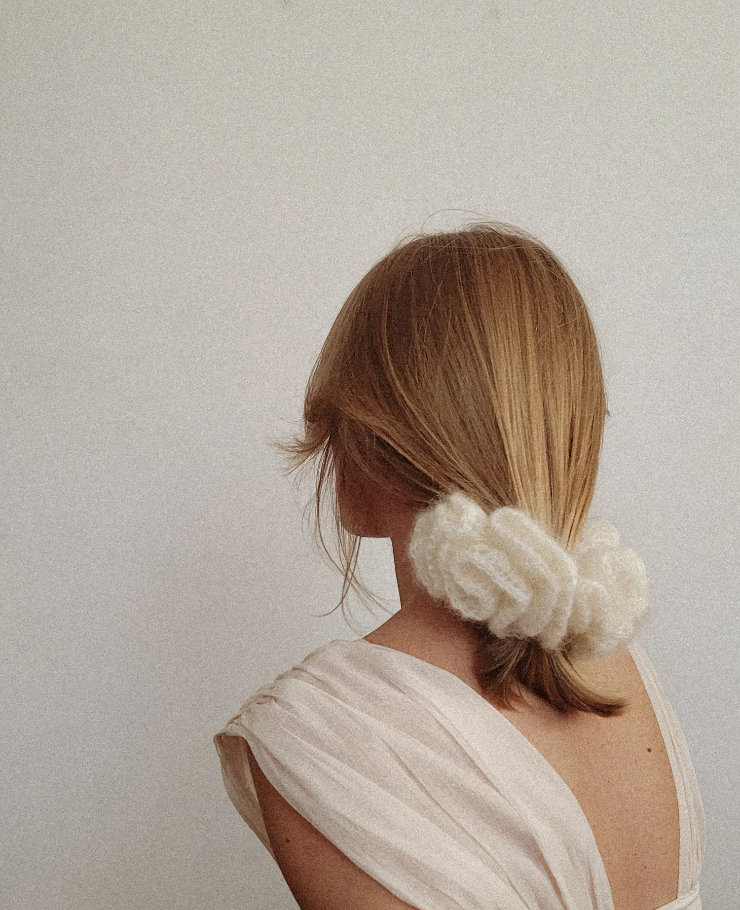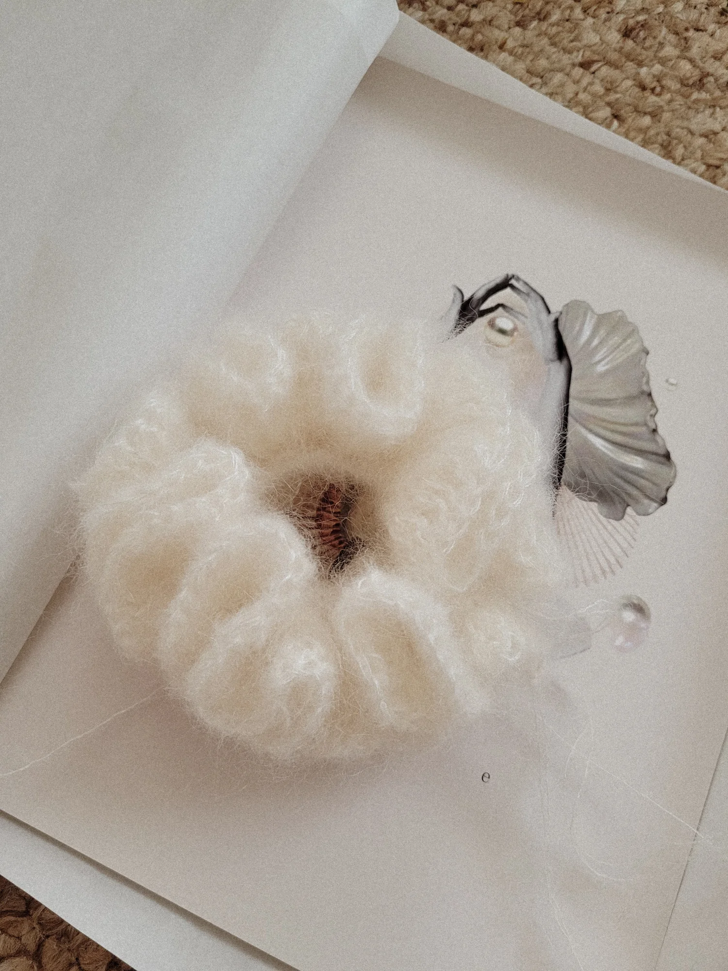 Gumka scrunchie w kolorze śmietankowym. Zrobiona ręcznie na szydełku z miękkiej i lekkiej wełny moherowej z dodatkiem jedwabiu morwowego. Wygląda pięknie na włosach lub jako ozdoba na nadgarstku.